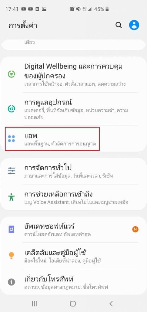 1.1 ให้ไปที่การตั้งค่า แล้ว เลือก แอพ
