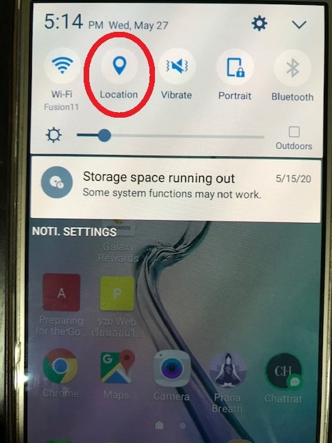 2.1 ที่หน้า Home ของมือถือ ให้เลื่อนสไลด์ลง หรือ บางรุ่น อาจจะสไลด์ขึ้น และ ให้สังเกตุรูปหมุดตำแหน่ง แตะค้างไว้ ที่หมุดตำแหน่งตรงนี้