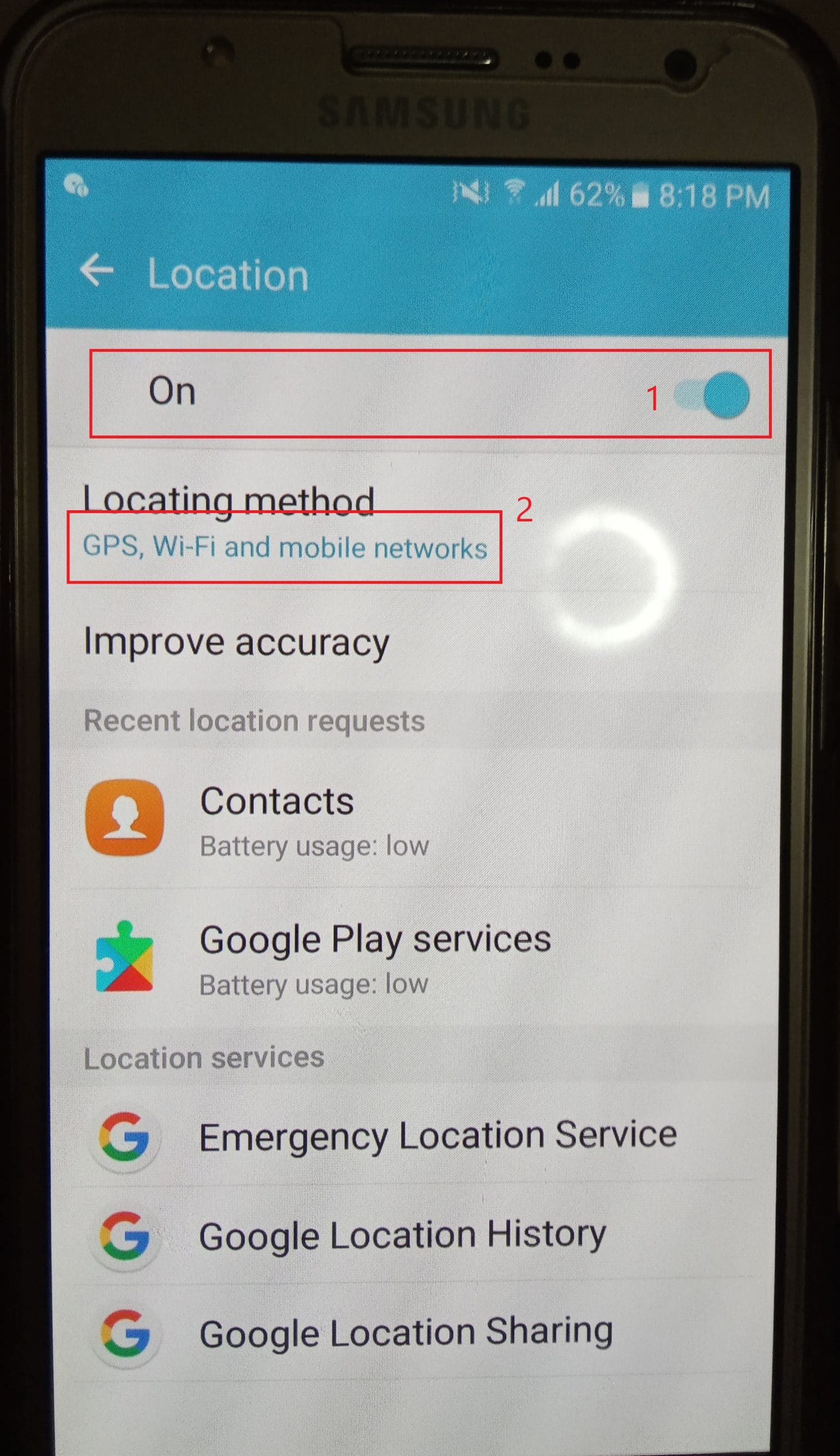 2.2 ต้อง Enable ให้ On ไว้ และ สังเกตุหัวข้อ “Locating method” ให้แตะที่ตัวหนังสือสีฟ้าๆ