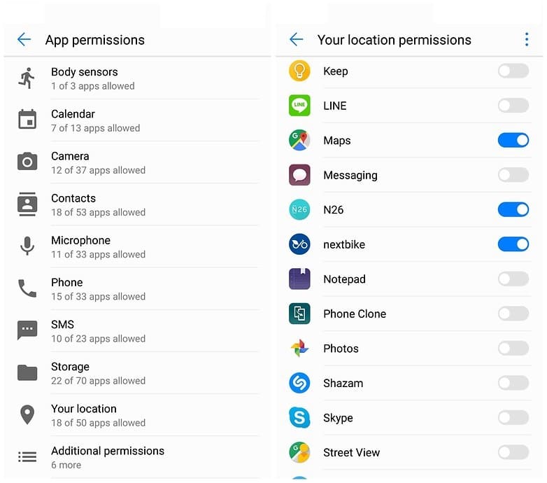 - ภายในเมนู”การอนุญาตแอพ” นี้จะมีระบุการเข้าถึงสิทธิ์ของแอพพลิเคชั่นต่างๆ โดยแบ่งเป็นหมวดหมู่ เช่น SMS, กล้องถ่ายรูป, ตำแหน่ง, ที่จัดเก็บข้อมูล เป็นต้น