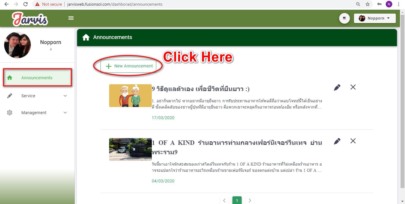 1.当您进入Web Jarviz的主页时,第一个菜单将被命名。 “公告”要发布公司新闻,请点击 ![]()