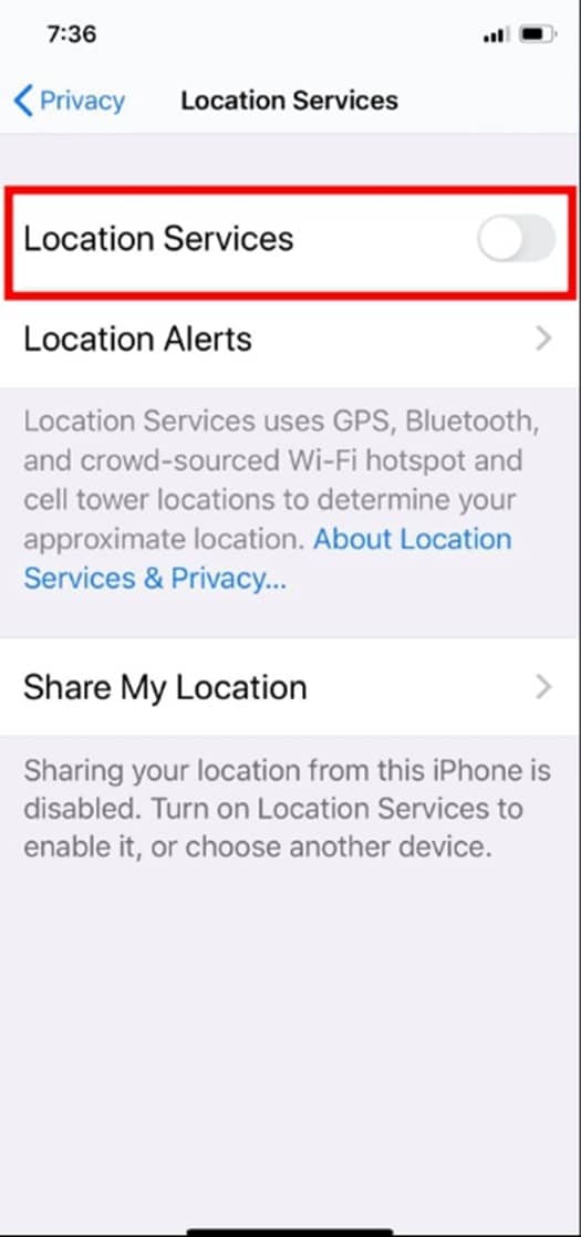 4. Location Services ကိစ္စရပ်များကို စီမံခန့်ခွဲရန် menuတစ်ခုကို တွေ့လိမ့်မည်။ Location Services ပိတ်ထားသော ပုံ ဖြစ်ပါသည်။