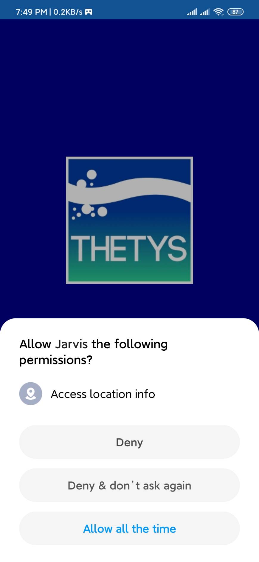 - Allow once – တည်နေရာ ၀န်ဆောင်မှု ဆိုင်ရာဒေတာများကို ရယူခွင့်ပြုမည်။ ဒီ app ကိုအသုံးပြုချင်သောအခါ ၊ (သို့မဟုတ်) ဒီ app ကို အသုံးပြုခြင်းကိုရပ်တန့်ပြီးနောက် လာမည့် Jarviz app ကိုပြန်လည်အသုံးပြုချင်လာသောအခါ၊ စသော အကြောင်းအရာများကို အောက်တွင်ဖော်ပြထားသောပုံ၌ရှိသည့်အတိုင်းထပ်ခါထပ်ခါမေးမြန်းလိမ့်မည်။ Applicationကိုအသုံးပြုစဉ်ခွင့်ပြုသည်။ ဤApplicationကို အသုံးပြုရန်ကိုနှိပ်ပြီးပါက Jarviz ကိုအကြောင်းကြားတော့မည်မဟုတ်ပါ။