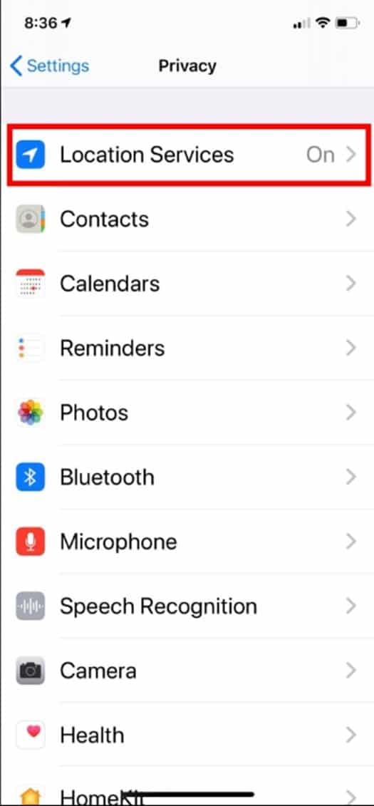 3. Location Services ဖွင့်ထားသည် (သို့မဟုတ်) ပိတ်ထားသည်လား အရင် စစ်ဆေးကြည့်ပါ။တကယ်လို့ Location Services ပိတ်ထားသည်ဆိုလျှင် အရင်ဆုံး Location Services ကို ဖွင့်ထားဖို့ လိုအပ်ပါသည်။Application ကိုရှာရန် အောက်သို့ ဆင်းပါ။